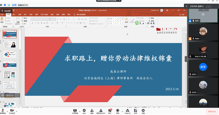 为进一步提高2023届毕业生对《劳动法》的了解,在未来的实习和就业中保护好自己的劳动权益,智能制造学院开展了本次求职就业劳动法律专场讲座,作为2022年“职”向未来系列活动的首次活动。 3月17日,智能制造学院邀请北京金诚同达(上海)律师事务所的庞春云律师为2020级全体同学带来了《求职路上,赠你劳动法律维权锦囊》专题网络讲座。 讲座上,庞律师妙语连珠,以生动的案例与劳动法法条相结合,向同学们传授了十条保护劳动权益的“锦囊”。此外,同学们也积极参加互动,主动发问,提出了自己对于实习期、劳动合同等方面的疑惑,并收到了庞律师详实的解答。 最后,庞律师也结合自身在律所的工作经验,为同学们的就业选择、求职面试等方面提供了诚恳的建议。(图/文 陆旻忆 审核/孙笪忠)