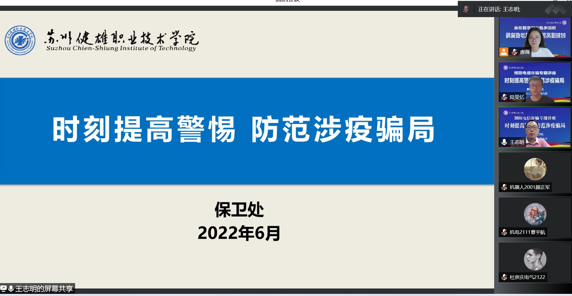 为维护校园安全,减少电信诈骗案件,保障学生切身利益。6月6日晚,智能制造学院邀请保卫处王志明副处长为学生们做“时刻提高警惕 防范涉疫骗局”安全知识讲座,线上三百余名师生参与。 王志明说,疫情期间,一些不法分子打着疫情防控的幌子实施诈骗,同学们要引起高度重视和警觉,认清变化多端的套路,保护好手机、身份证、银行卡、支付宝等个人信息,遇到疑似诈骗问题要立即联系校园110或者辅导员老师。 王志明通过讲解身边的案例给同学们分析了诈骗分子的常见套路以及如何识别诈骗套路。通过这些生动的案例他希望同学们可以守好自己的财物,提高安全防范意识,把被诈骗的风险降到最低。 讲座中,同学们认真听讲,并通过线上留言板与老师时时互动。近年来,电信网络诈骗频发,智能制造学院通过定期开展防骗教育,提高学生对诈骗手段、形式等的认知水平,用宣传教育主动抵御诈骗风险。(图文/唐薇 审核/孙笪忠)