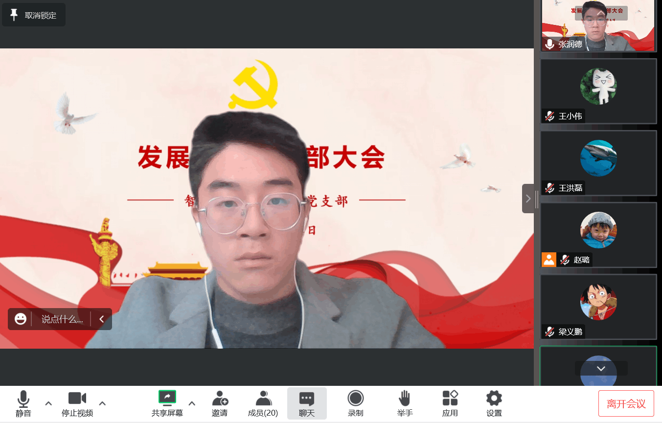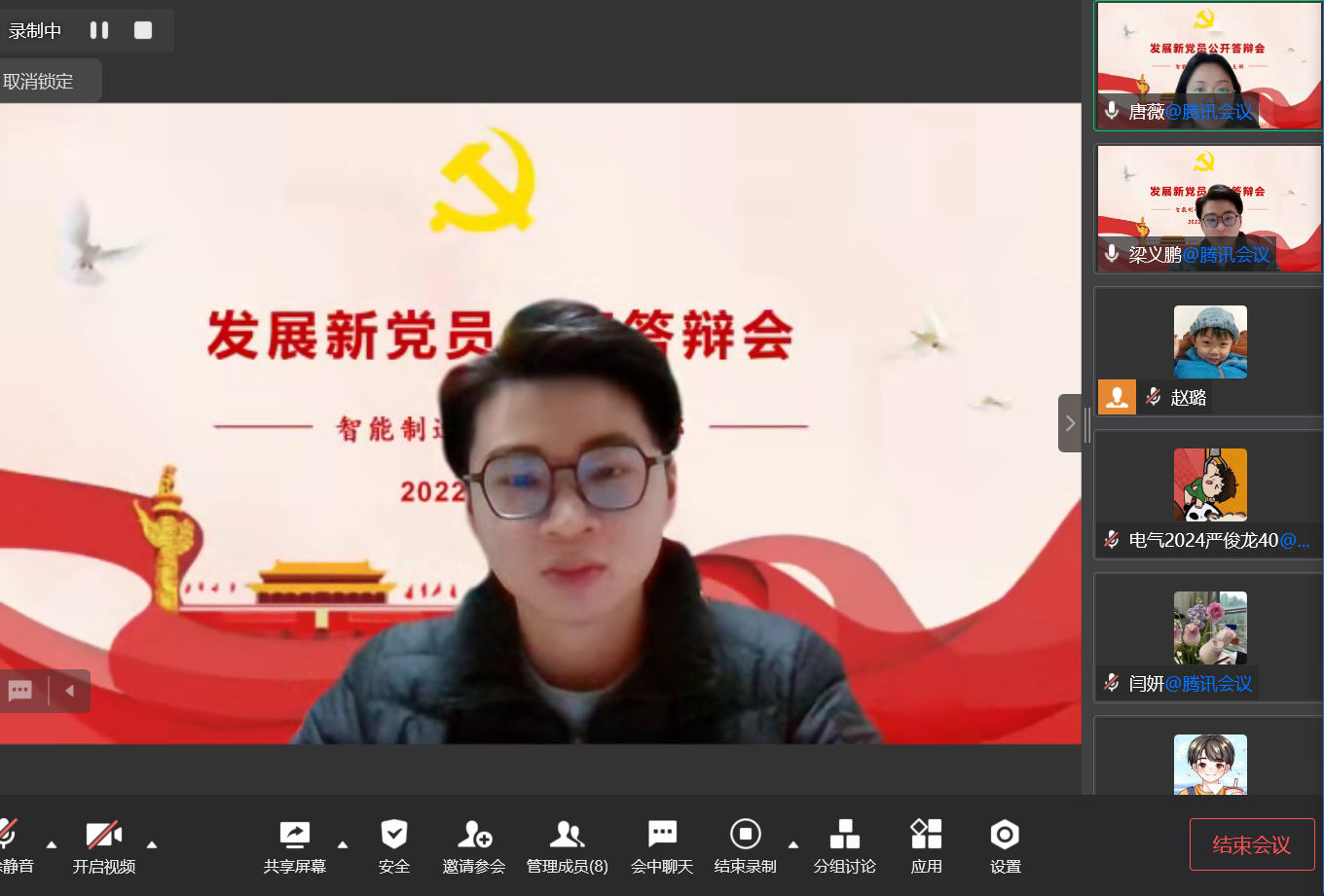 12月24日下午,智能制造学院学生党支部在线上召开支部大会。学生党支部教师党员、发展对象介绍人、发展对象参会。 会议严格按照规定的程序进行。首先,主持人介绍到会党员人数、正式党员人数、要发展的人数及发展程序。然后由发展对象宣读入党志愿书,入党介绍人介绍其综合表现,支部委员介绍其情况,再由到会党员对发展对象发表意见。与会的同志一致认为拟发展的周备豪、梁义鹏、张润德、王海川、严俊龙同学入党动机端正,拥有坚定的政治立场,对党的认识准确,政治历史清白,各方面表现良好,符合共产党员的条件。最后,全票通过吸收5名拟发展对象为中共预备党员。 为确保党员发展质量,全面综合考察发展对象的对党的基本理论知识的掌握情况、对中国共产党的认识以及如何在实际工作和学习中发挥先锋模范作用、践行党员先进性,学生党支部于12月20日晚召开学生发展对象公开答辩会,五位发展对象均顺利通过答辩环节。(图文/唐薇 审核/孙笪忠)
