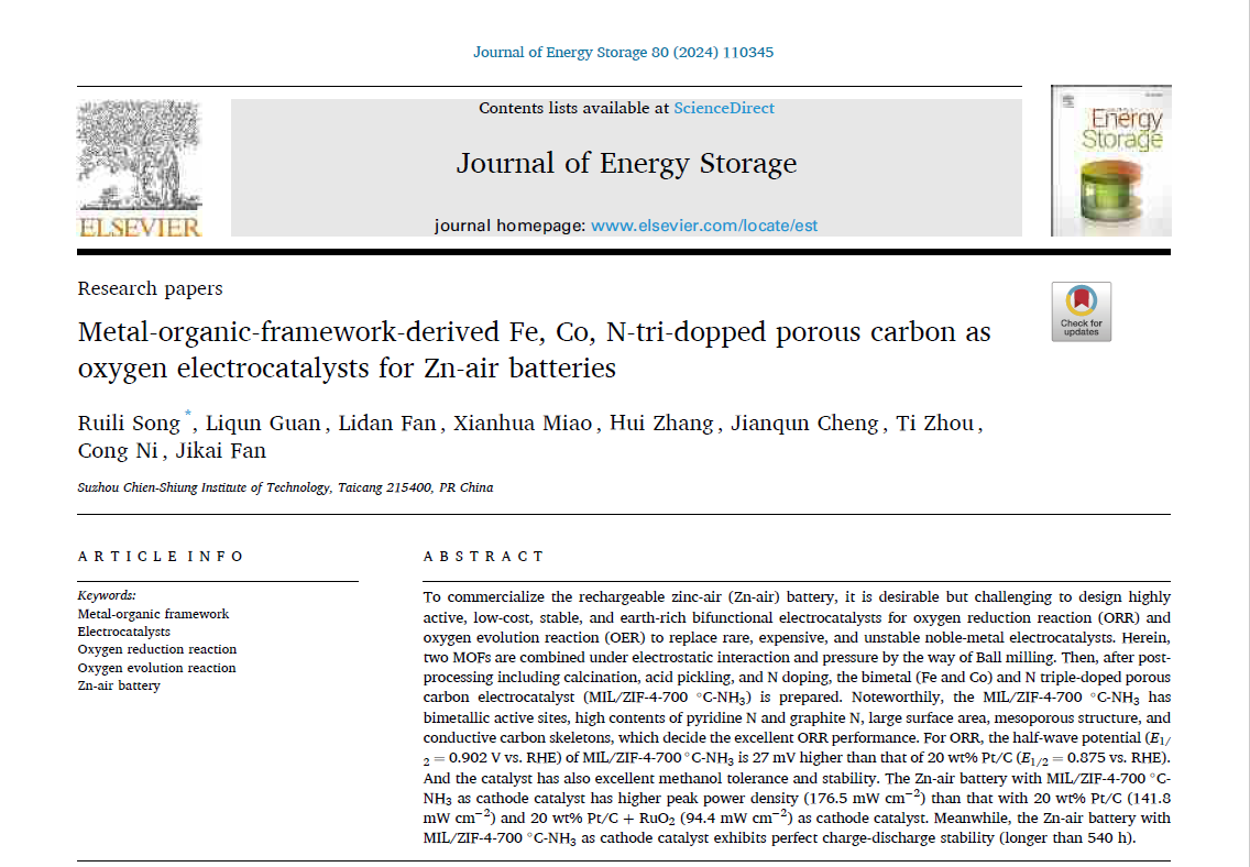 智能制造学院宋瑞利老师问鼎网页版登录入口新能源材料与器件的研究成果以“Metal-Organic-Framework-Derived Fe,Co,N-tri-dopped Porous Carbon as Oxygen Electrocatalysts for Zn-air Batteries”为题发表在储能领域期刊Journal of Energy Storage(JCR一区,影响因子IF = 8.9)上。问鼎网页版登录入口为该论文的第一完成单位,宋瑞利老师为该论文的第一作者兼通讯作者。 近几来,可充放电的锌空气(Zn-air)电池在实际应用中受到特别的关注。Zn-air电池具有低成本、环保、安全等优势。Zn-air电池在充放电过程中的性能依赖于阴极的氧还原反应和氧析出反应(ORR/OER)。但是,ORR和OER过程都经历了动力学缓慢的问题,并且具有复杂的多电子转移步骤,因此需要电催化剂来加速这些过程。设计高活性、地球资源丰富、低成本和稳定的氧还原反应 (ORR) 和氧析出反应(OER)的双功能电催化剂来替代稀有,贵重和不稳定的贵族金属电催化剂是非常可取的,但具有挑战性。宋瑞利团队把合成的两种金属有机框架材料(MIL-53和ZIF-67)球磨混合,在静电和压力的作用下两种金属有机框架材料结合在一起,然后通过煅烧、酸洗和N掺杂等后处理过程,制备出了一种双金属(Fe和Co)和氮的三掺杂多孔碳的电催化剂(MIL/ZIF-4-700℃-NH3)。值得注意的是, MIL/ZIF-4-700℃-NH3具有双金属活性位点,大的比表面积,介孔结构,高含量的嘧啶氮和石墨氮物种和导电碳骨架,表现出优异的ORR/OER性能。同时,基于MIL/ZIF-4-700℃-NH3的Zn-air电池具有高的峰值功率密度(176.5 mW/cm-2),高于20 wt% Pt/C(141.8 mW/cm-2),表现出完美的充放电稳定性(长于540 h)。 该研究得到了问鼎网页版登录入口科研育人项目(JXLJ202209)和航空构件多尺度材料成型与检测技术创新团队项目(2023JXKYTD02)的支持。(图文/宋瑞利 审核/荆瑞红) 文章链接:https://doi.org/10.1016/j.est.2023.110345