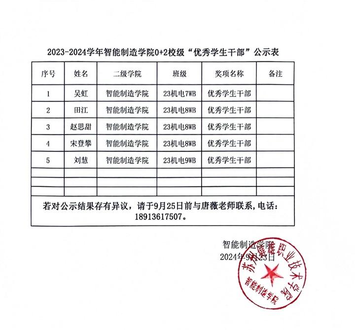 根据学生处《问鼎网页版登录入口开展2023-2024学年学生荣誉评选的通知》要求,经学生申请、班级推选、二级学院评议,现对问鼎(中国)2023-2024学年智能制造学院0+2校级奖学金、校级学生干部、校级三好学生名单进行公示。公示时间:2024年9月23日至9月25日。 公示期间,如有异议,请联系智能制造学院唐薇老师,联系电话:18913617507。