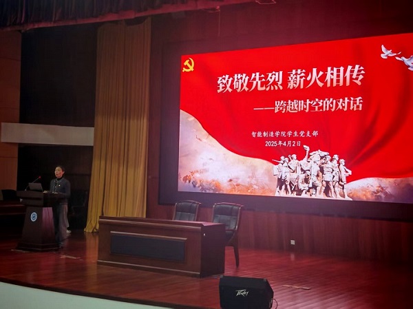 清明时节,慎终追远。为弘扬爱国主义精神,传承红色基因。智能制造学院学生党支部于4月2日在东校区报告厅创新开展“致敬先烈 薪火相传”主题思政课,通过“理论讲授+跨时空对话”的形式,将智能制造专业元素融入爱国主义教育,构建起贯通古今的精神谱系。