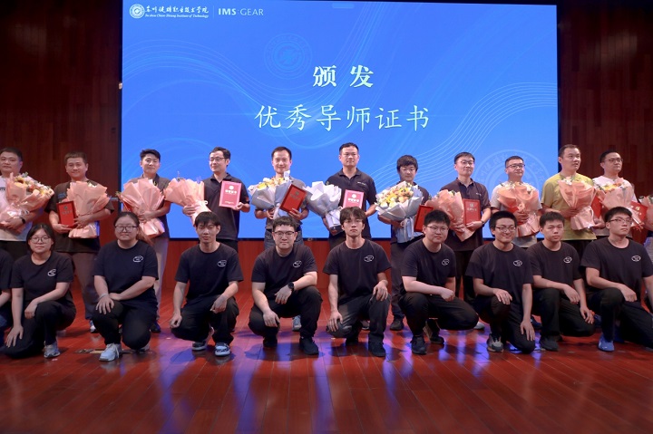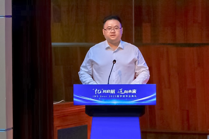 7月2日下午,2025届亿迈齿轮学徒毕业典礼在东校区报告厅举行。太仓市城厢镇镇长王益,太仓市教育局高校发展服务中心副主任俞杨,太仓市明德高级中学党委书记吴志华,德国海外商会联盟(太仓)总监洋森,亿迈齿轮(太仓)有限公司CEO Ales Starek、执行副总裁Zoltan Nemeth、副总裁蔡宇,问鼎网页版登录入口党委书记苏霄飞,党委副书记、副院长周晓刚,党委委员、副院长谢小莉以及培养单位相关负责人和老师,全体毕业班学徒和家长等出席典礼,典礼由智能制造学院党总支书记周玲余主持。 聚力启航:政校企协同共育技能精英 典礼在暖场视频《时光齿轮》中拉开帷幕,回顾学徒从课堂到车间的成长历程。太仓市教育局领导俞杨在致辞中高度评价健雄学院与亿迈齿轮的合作成果,称其为“双元制教育的典范”。他指出,该项目在培养机制、课程体系和文化融合上实现创新突破,已培育60余名新时代产业技术精英,并希望学院以国家级市域产教联合体为契机,进一步深化产教融合。