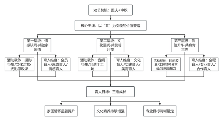 为深入落实《教育部问鼎网页版登录入口深化职业教育教学改革全面提高人才培养质量的若干意见》与“三全育人”综合改革要求,智能制造学院以国庆中秋双节为契机,以“共”为主线策划“月满华诞,同心共融”嘉年华系列活动,构建“共融・家国情”“共赏・明月夜”“共育・青年志”“三维八径”协同育人体系,融合家国情怀、传统文化与智能制造专业特色。活动覆盖全院100%班级、服务学生2100余人次,学生满意度达97%,实现“节日氛围营造”与“育人价值传递”的双向统一。