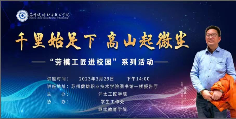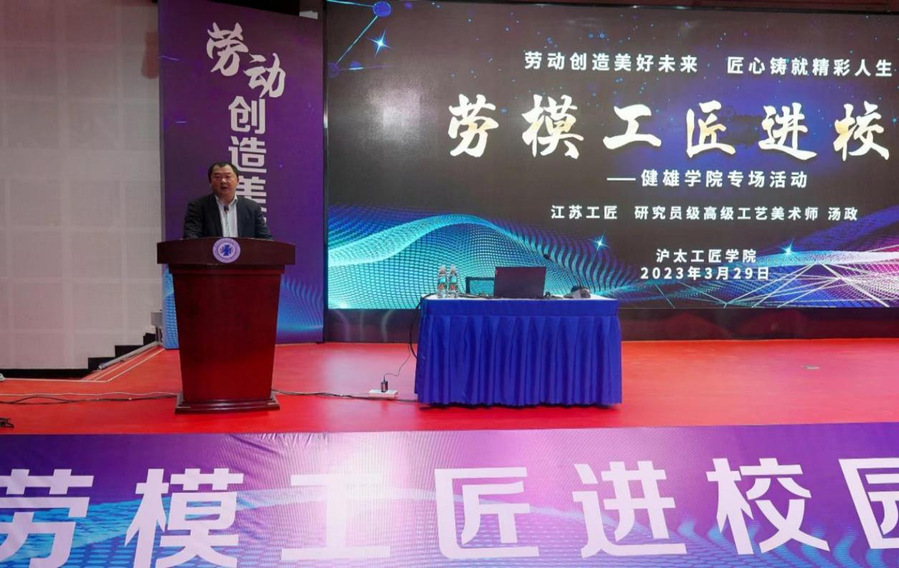 为深入贯彻落实习近平新时代中国特色社会主义思想,大力弘扬劳模工匠精神,引导广大师生树立正确的人生观、成才观、择业观,以劳模工匠精神激励广大师生为学校事业发展再立新功,3月29日下午,沪太工匠学院在问鼎(中国)图书馆报告厅举办“劳模工匠进校园”活动,邀请“江苏工匠”——沪太工匠学院讲师团特聘讲师汤政先生为师生作专题报告,在学生工作处及各二级学院的支持发动下,报告厅座无虚席,380余名师生至活动现场聆听报告会。社会教育学院院长苏志勇出席并主持本次活动。