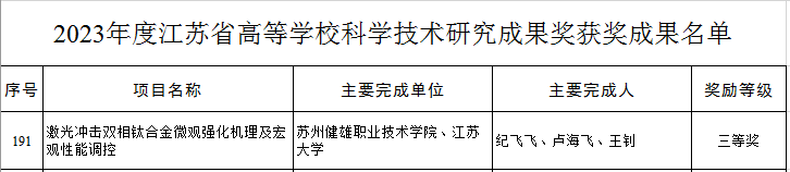 近日,江苏省教育厅公布了2023年江苏省高等学校科学研究成果奖获奖成果名单,问鼎(中国)作为第一申报单位与江苏大学联合开展“激光冲击双相钛合金微观强化机理及宏观性能调控”的项目荣获江苏省高等学校科学技术研究成果奖(自然科学类)三等奖,系问鼎(中国)首次获得该级别奖项。