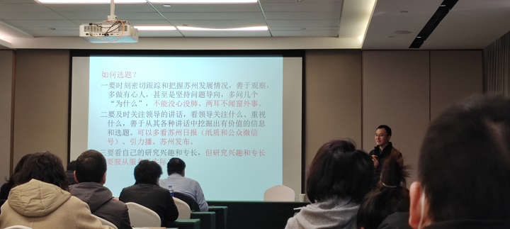 南京大学长江产业发展研究院副院长江静教授、苏州市政府研究室科研处长成涛林、江苏省政协理论研究会(原江苏省副省长)徐鸣分别在研讨会中做了专题讲座,对决策咨询报告的撰写、选题、调查研究的方法等做了详尽的报告。此外,江苏长江产业经济发展研究院苏州研究中心主任徐天舒教授,就决策咨询报告常见通病进行分析,并对历年获批示高质量报告及参会人员以往提交报告进行了点评。