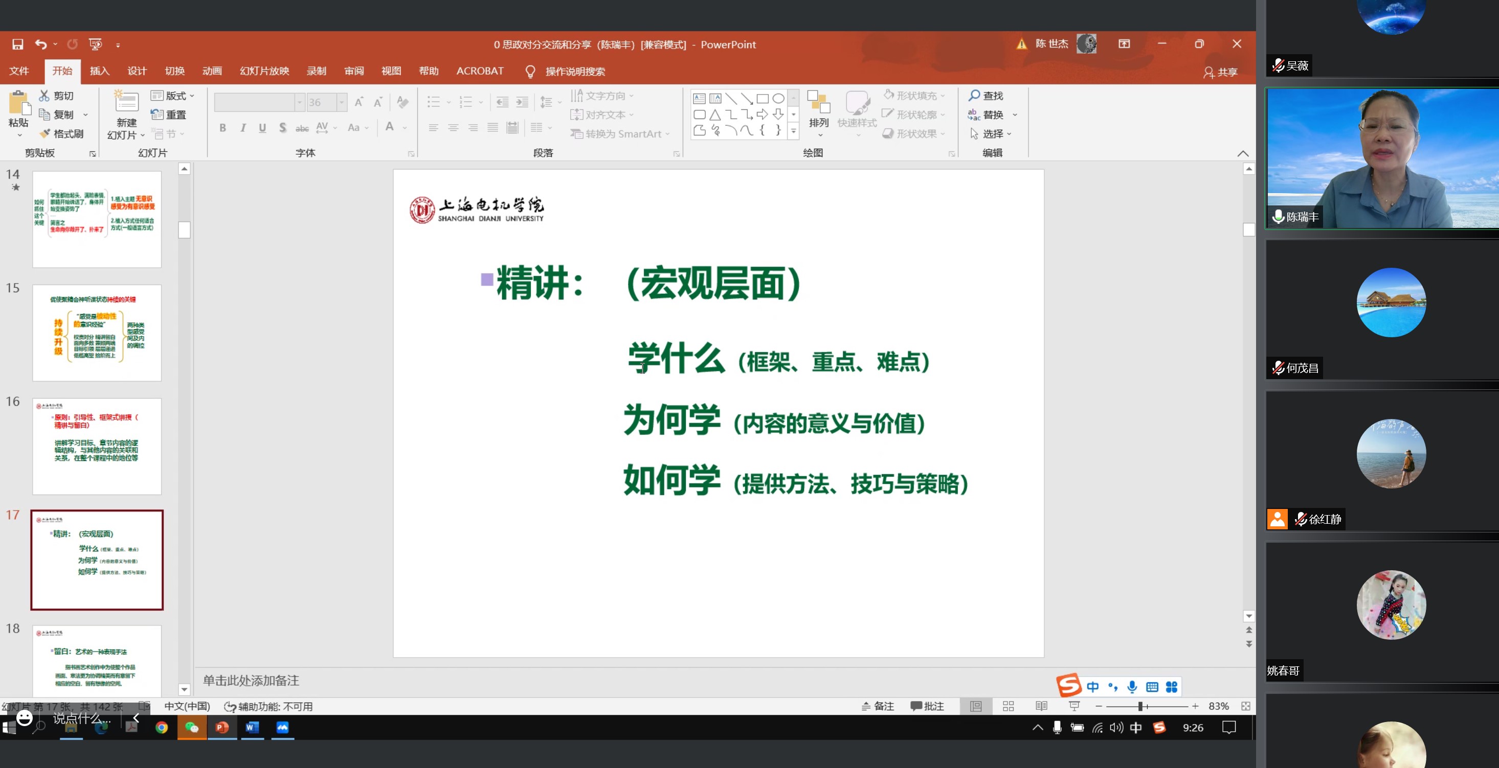 为积极推动我校思政课改革创新,进一步提升思政课教师的教学能力,努力打造新时代思政“金课”,2022年9月22日上午,我校马克思主义学院邀请《对分课堂之高校思想政治理论课》作者、上海电机学院副教授陈瑞丰博士线上开讲“思政课对分教学分享”专题讲座。讲座由思政教研室吴薇副教授主持,思政教研室全体专任教师参加了本次活动。