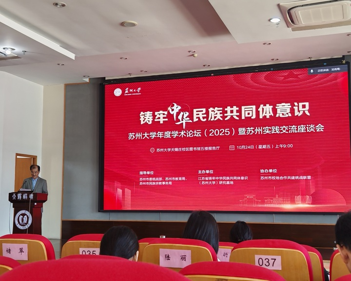 2025年10月24日上午,铸牢中华民族共同体意识苏州大学年度学术论坛(2025)暨苏州铸牢中华民族共同体意识研究实践交流座谈会在苏州大学天赐庄校区召开。我校宣传部副部长何茂昌、马克思主义学院思政教师吴洁应邀参会,与省内外高校统战工作负责同志、专家学者共同探讨相关实践路径。