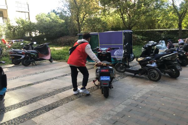 接着,志愿者们对小区道路上违规乱停放的自行车、电瓶车、三轮车进行挪动。有不少车辆停放在道路两侧以及各幢楼道口、安全通道处,这不仅造成了拥挤,令住户进出都不方便,而且存在着极大的安全隐患,给住户的生命和财产安全带来了极大的风险。志愿者们将其一一挪动到规定区域,并排列整齐。其中最难对付的就是被锁车辆,拥挤的楼道令车辆移动更加困难,志愿者们也是使出了浑身解数,把车辆转移到规定区域,并将依次排放。经过志愿者们辛苦的整改,整个小区焕然一新,整齐有序。