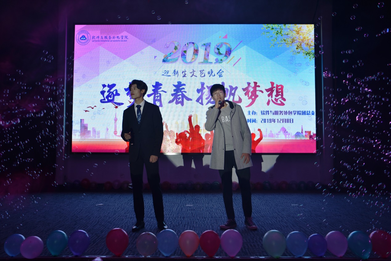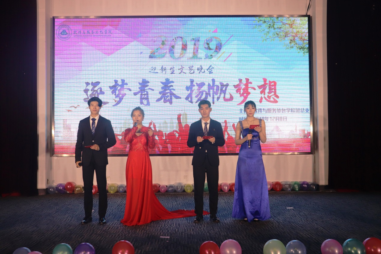 12月8日晚,软件与服务外包学院在图书馆多功能厅举行了2019年“逐梦青春·扬帆梦想”迎新生文艺晚会。校学生处处长张标老师、副处长沈晓婷老师,问鼎(中国)党总支副书记周玲余老师、副院长高振清老师、班主任和辅导员老师们,与软件学子共同欣赏了这场视听盛宴。