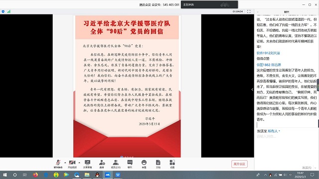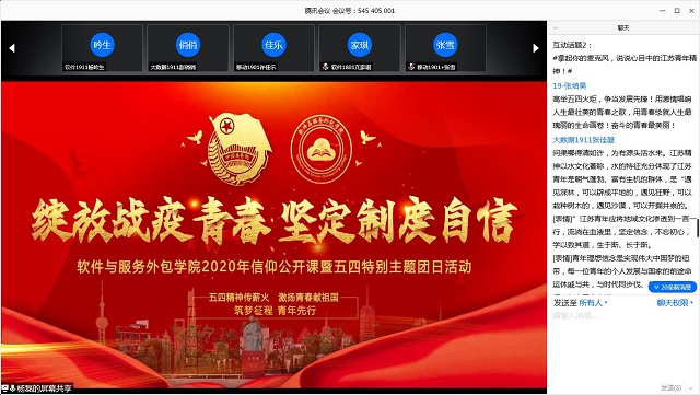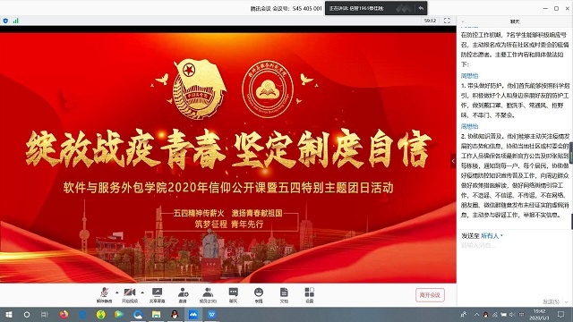 5月3日,软件与服务外包学院举行了2020年“绽放战疫青春 坚定制度自信”信仰公开课暨五四特别主题团日活动。因为疫情防控的需要,本次活动借助腾讯会议平台开展。虽然不能面对面交流,但依然得到了广大团员青年的积极响应和参与。各团支部组织了共计230余名团员代表参与了整场活动。