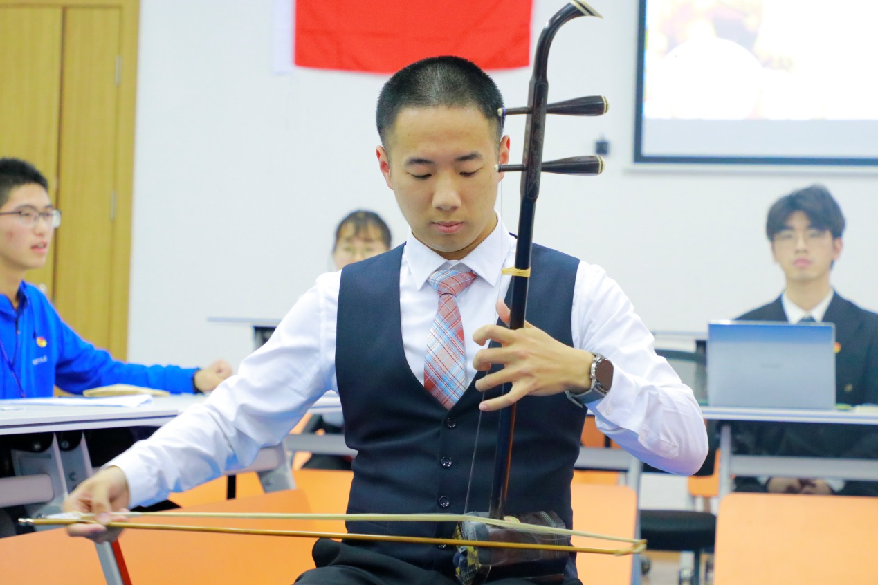 张正轩带来的二胡独奏《在希望的田野上》之后,刘立鑫同学结合视频《后浪》,围绕国家安全、青年使命等关键词,结合时事热点以及自身故事,让在场的每一个人都充分认识到我们这一代青年身兼重任,应继承和发扬“爱国、进步、民主、科学”的五四精神。我们要坚定不渝地拥护中国共产党的领导,坚守国家安全底线。在社会建设层面,我们每个人都应该坚守在自己的岗位,踏实、勤奋地工作。