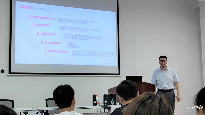 6月9日下午,人工智能学院开展“学党史,办实事,促就业”就业季莱克电气专场分享会。 莱克电气智造一部部长王瑞丰做了《初入职场》专题讲座。