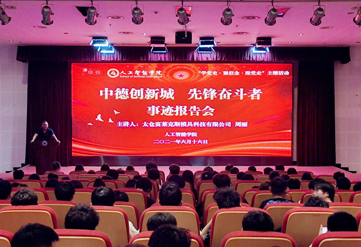 6月16日晚,人工智能学院举办“中德创新城,先锋奋斗者”事迹报告会,2019和2020级各班学生干部参与了报告会。本次活动邀请了健雄学院07级优秀毕业生、校友、太仓市高新区党工委奋斗者之星、太仓富莱克斯模具科技有限公司总经理周丽为在场的同学们做了《在奋斗中前行》专题报告。