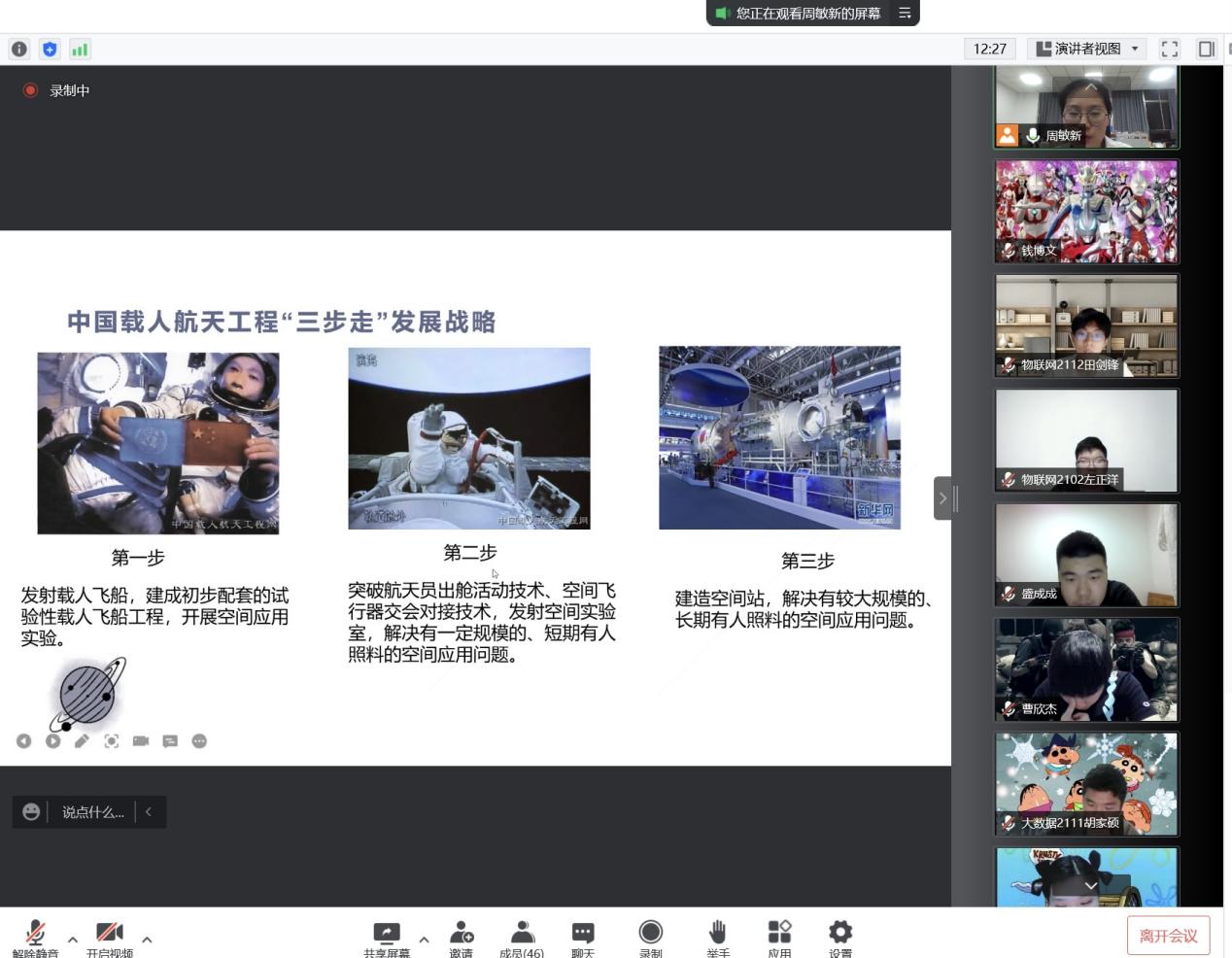 4月23日晚上,在第七个“中国航天日”前夕,人工智能学院辅导员周敏新老师通过腾讯会议的方式,给21级学生干部上了一节线上微党课之弘扬载人航天精神,砥砺奋进伟大征程。