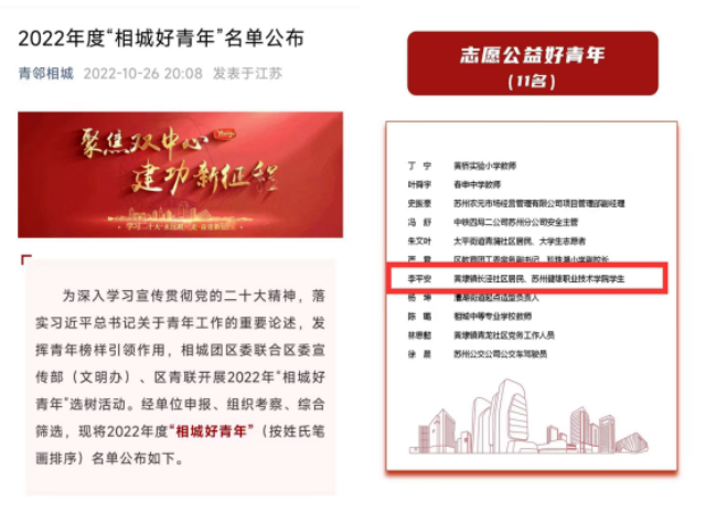 近日,在相城团区委联合区委宣传部(文明办)、区青联开展的2022年“相城好青年”选树活动中,人工智能学院软件2111班李平安被评为“志愿公益好青年”。