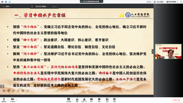 11月11日晚,为提高学生入党的积极性,加强学生爱国爱党的情怀,强化自身担当和民族使命,周懋怡、周敏新两位辅导员老师面向2022级新生开展了入党启蒙教育。两位老师带领同学们从党的性质、党的指导思想、党的四项基本原则、二十大报告中的新表述新概括新论断等方面学习了最新的中国共产党章程;组织同学们围绕如何树立正确的入党动机、如何成为一名合格的学生党员等话题,展开了热烈的探讨;详细讲解了大学生入党的基本程序以及入党申请书的书写要求等,希望同学们能够坚定共产主义信念,端正入党动机,用实际行动向党组织靠拢。讲座最后,2021级入党积极分子领学由中青报特约评论员撰写的文章《争做有理想、敢担当、能吃苦、肯奋斗的新时代好青年——五论学习贯彻党的二十大精神》,号召同学们要坚定不移听党话、跟党走,怀抱梦想又脚踏实地,立志做有理想、敢担当、能吃苦、肯奋斗的新时代好青年。