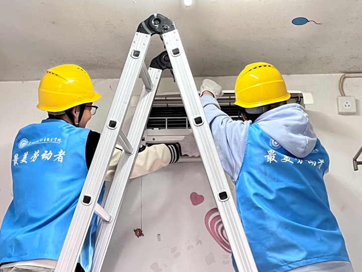 活动前,辅导员组织参与活动的同学集中观看并学习了空调清洗的操作流程和安全注意事项。活动中,大家分工明确,对滤网进行全面细致地清洗。同时,还为同学们讲解了使用、保养空调方面的知识。“长期不清洗空调会有诸多危害,不但容易导致制冷、制热效果下降,还有可能产生异味,滋生细菌,危害身体健康。”