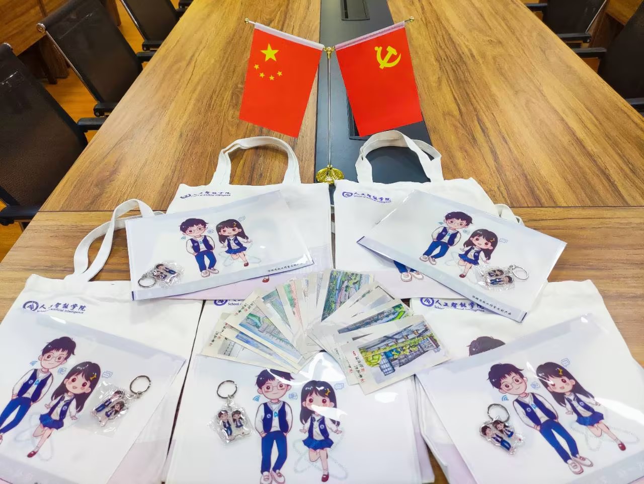 钥匙扣、文件袋、帆布包上则印着“小A小I”学院吉祥物, 是人工智能学院怡姐思政工作室打造的特色IP人物,阳光帅气的小A同学,眼神中充满睿智的光芒,展现了人工智能学子学习工作时的严谨。青春活泼的小I同学,裙舞飞扬,分享青春的美好也成为了校园内一道靓丽的风景线。巧合的是,“小A小I”的设计者也在此次转正之列,亲眼见证了自己的设计心血落地变成实物。