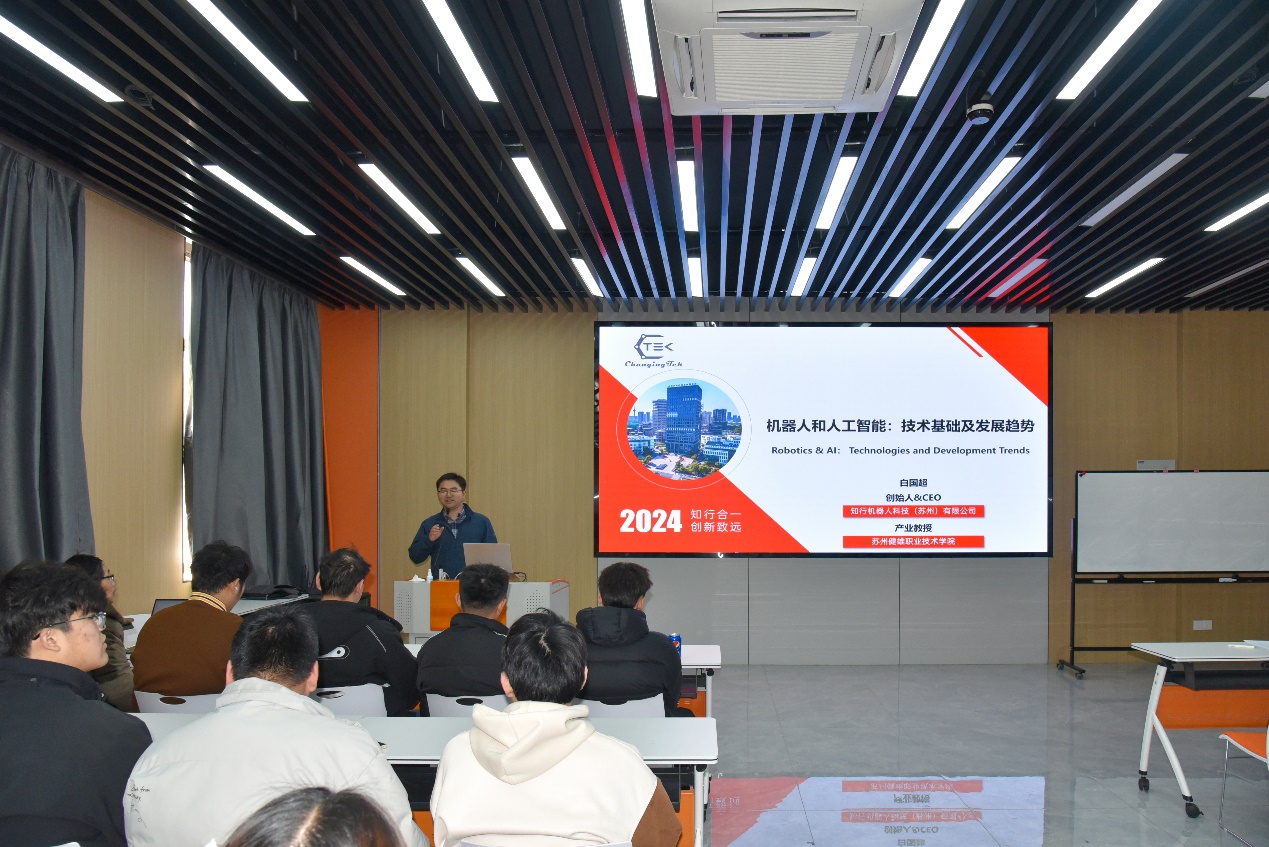 人工智能作为当今科技领域的热门话题,正在以前所未有的速度改变着我们的生活和工作,正引领未来发展的新模式。1月12日下午,人工智能学院邀请知行机器人科技(苏州)有限公司总经理、产业教授白国超博士来校为人工智能技术应用专业师生开展了一场《机器人与人工智能前沿技术》的专业讲座,共有120余位师生参加了本次讲座。