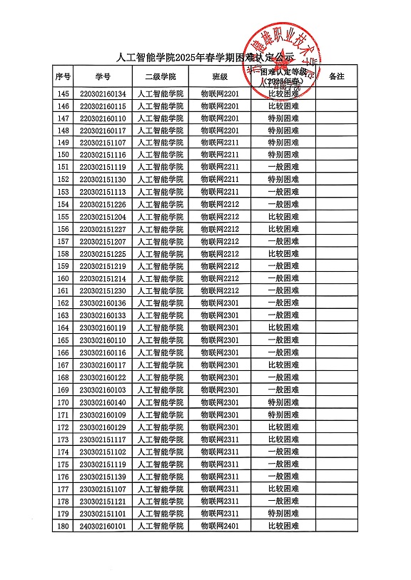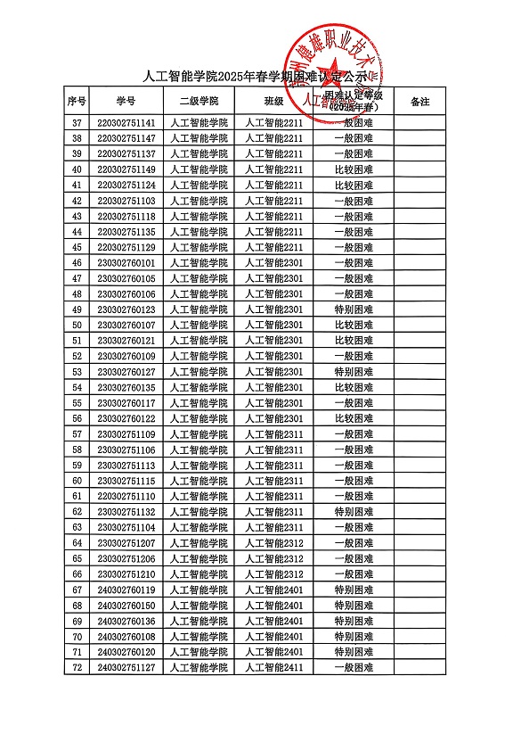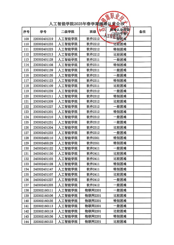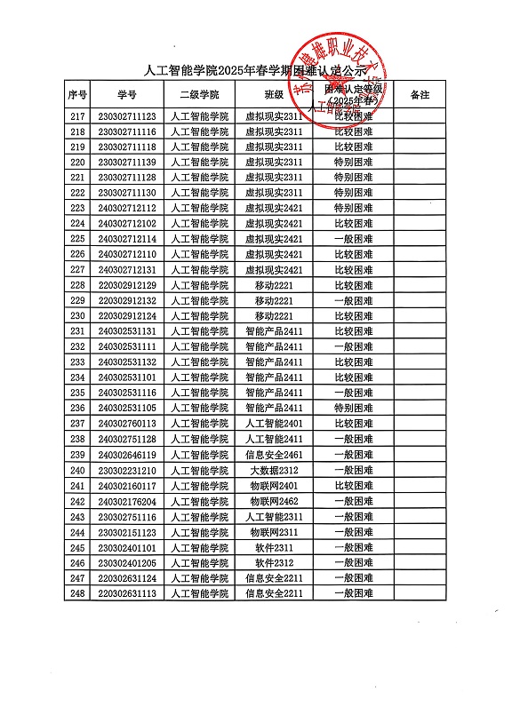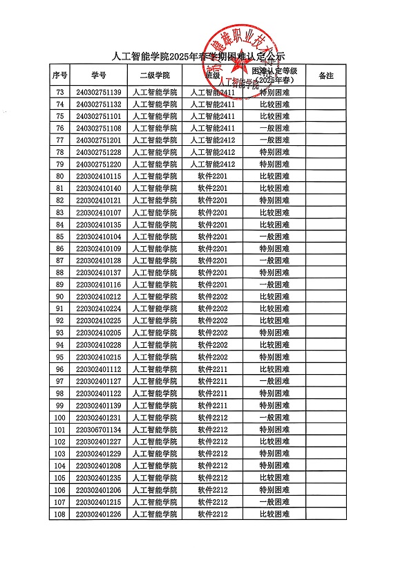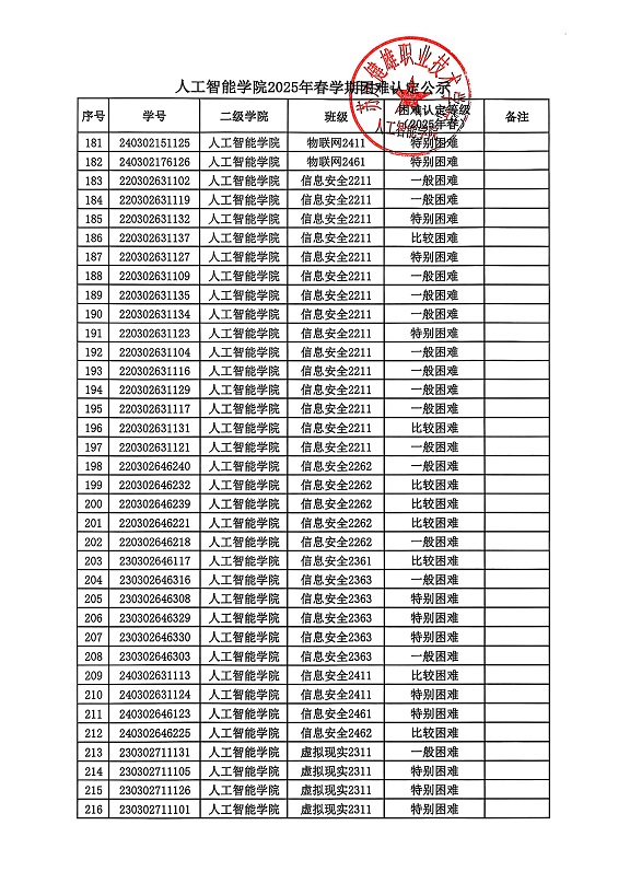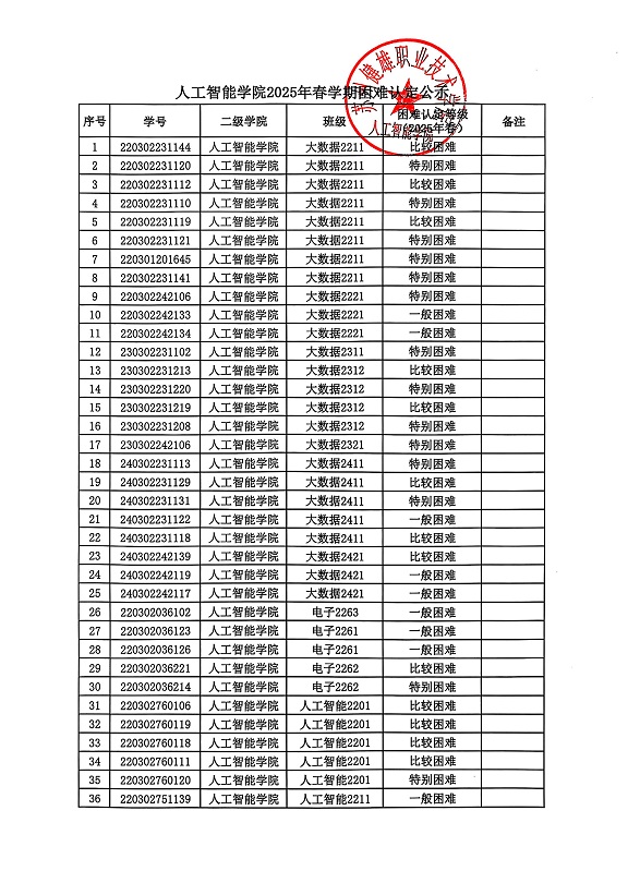 根据校学生处《问鼎网页版登录入口做好2025年春学期国家助学金复评及发放工作的通知》相关要求,经学生申请、班级民主评议、审核、二级学院复核等环节,现将人工智能学院2025年春学期困难认定公示如下。