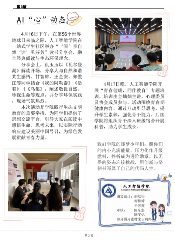 春风拂面、骄阳初升,人工智能学院《AI的心期刊》2025年第二期“绿满人间,心沐暖阳”如约而至。学院借期刊关注心理健康,鼓励同学们在校园中发现美好、探索内心,愿这份温暖伴你青春成长。