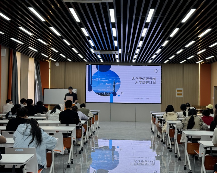 太仓电信维护安装部项目经理吴欣远从智能网联工程师的需求与前景、学习内容与课程安排、双元培养待遇及协议和太仓电信装维队伍四个方面给大家做了介绍,周敏新简要介绍了该双元项目的初衷,并就大家普遍关心的问题进行解释说明。