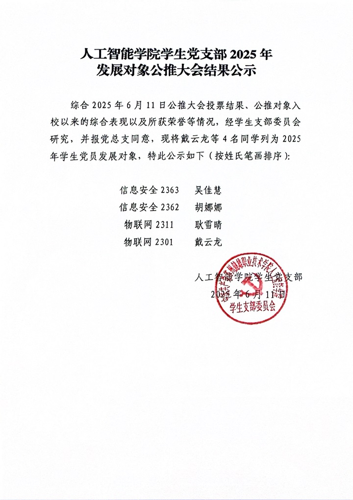 综合2025年6月11日公推大会投票结果、公推对象入校以来的综合表现以及所获荣誉等情况,经学生支部委员会研究,并报党总支同意,现将戴云龙等4位同学列为2025年学生党员发展对象,特此公示如下(按姓氏笔画排序)。