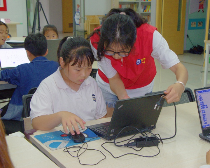 活动中,志愿者们向孩子们讲解了环境保护和垃圾分类的基本知识,展示了目前人工智能赋能绿色工业和城市治理的先进案例。随后,孩子们结合志愿者的实操演示,顺利完成了自动化垃圾分类的程序设计和调试。