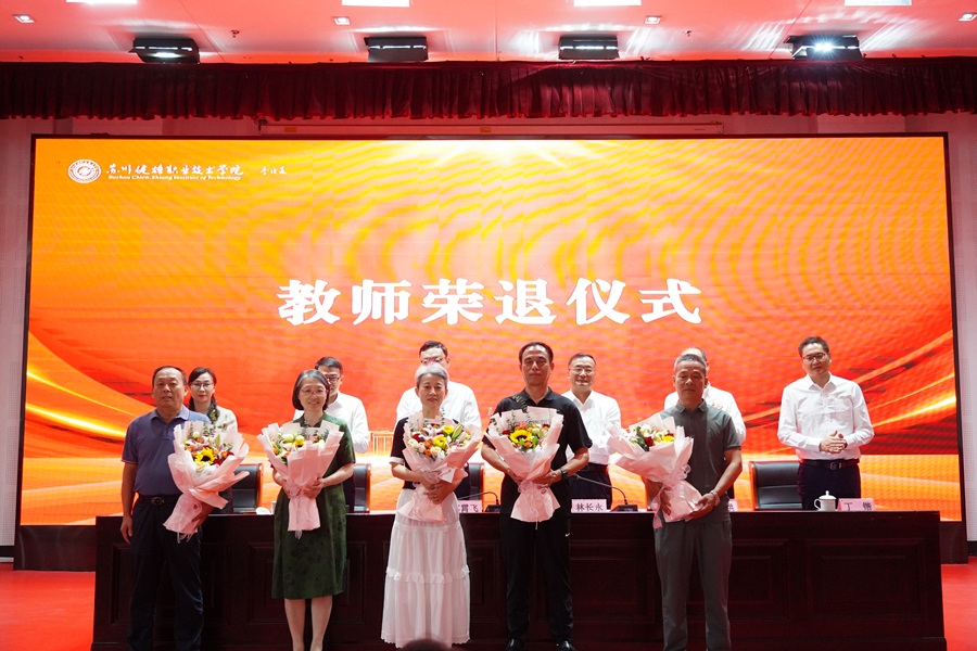 退休教师荣退环节,学院领导为退休教师献花。退休教职工将最美的年华与智慧奉献给健雄学院,现场掌声阵阵。