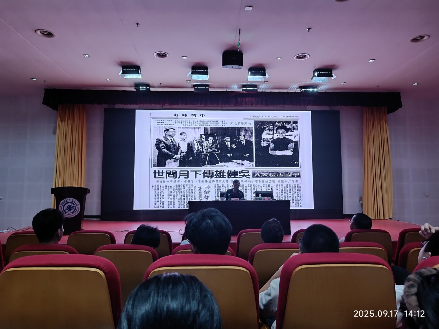 讲座中,江才健以吴健雄先生的故乡江苏太仓浏河镇为引,讲述了这位“东方居里夫人”如何突破时代桎梏,从封建思想浓厚的民国走向世界科学前沿。他特别提及吴健雄父亲吴仲裔的远见,以及其父亲的开明与理解对吴健雄先生一生的影响,生动诠释了吴健雄“爱国、创新、求实、律己”精神的家学渊源。