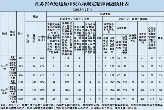 2023年7月,全省共查处违反中央八项规定精神问题419起,批评教育帮助和处理495人、其中给予党纪政务处分486人。从问题类型看,查处形式主义、官僚主义问题124起、批评教育帮助和处理145人,查处享乐主义、奢靡之风问题295起、批评教育帮助和处理350人。从人员级别看,批评教育帮助和处理县处级干部16人、乡科级及以下人员479人。