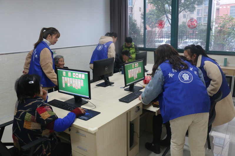 在德颐善社工的安排下,同学们分为若干个小组,各有分工。有的陪老人们拉家常、说笑话,讲故事;有的帮老人松肩膀,按摩腿,倾听老人们的念叨;有的到“书香阁”帮忙老人磨墨;有的到电脑房教老人学电脑;有的帮忙读报;有的帮忙调试按摩椅。虽然因为方言不通,沟通有点吃力,但是志愿者们个个都很热情。