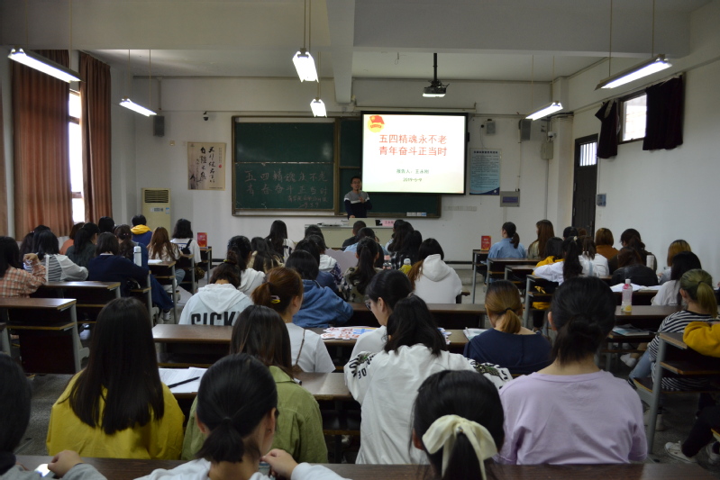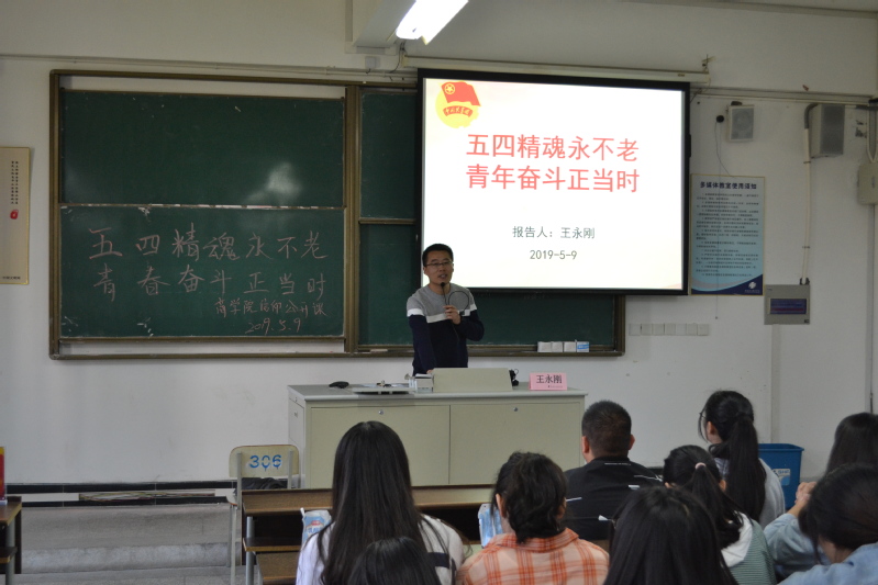 五月的激情,昭示着青春年华;崭新的时代,鼓舞着奋进的步伐。在这个朝气蓬勃的季节里,为了更好组织引导广大青年学生继承和发扬“五四精神”,2019年5月9日,在教室c3–304商学院邀请了学生处王永刚老师开展以“五四精魂永不老,青春奋斗正当时”为主题的青马信仰公开课,100多名优秀团员在一起共同追忆“爱国、进步、民主、科学”的五四精神。