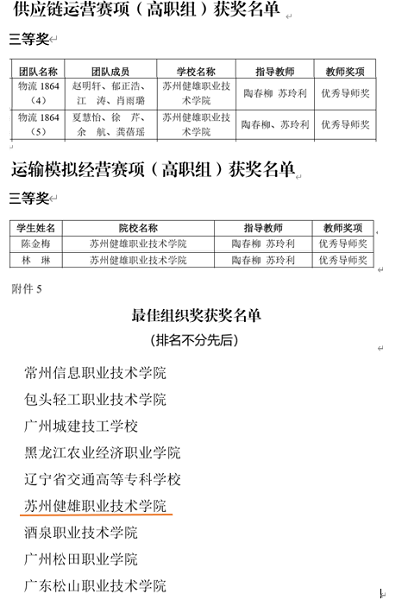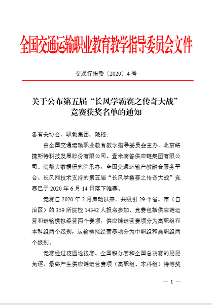 近日,由全国交通运输职业教育教学指导委员会主办,北京络捷斯特科技发展股份有限公司、壹米滴答供应链集团有限公司、满帮大数据研究院承办,全国交通运输产教融合服务平台、长风网提供技术支持的第五届“长风学霸赛之传奇大战”竞赛圆满落下帷幕,这是一次规模高、覆盖广的物流专业的线上大赛。在历时4个月的比赛中,商学院物流管理18、19级的同学们与来自全国29个省、市(自治区)的359所院校的14342名学生同场竞技,经过校园选拔赛、全国积分赛和全国总决赛的层层角逐,最终获得“供应链运营”三等奖两项、“运输模拟经营”三等奖两项,健雄学院也荣获最佳组织奖。