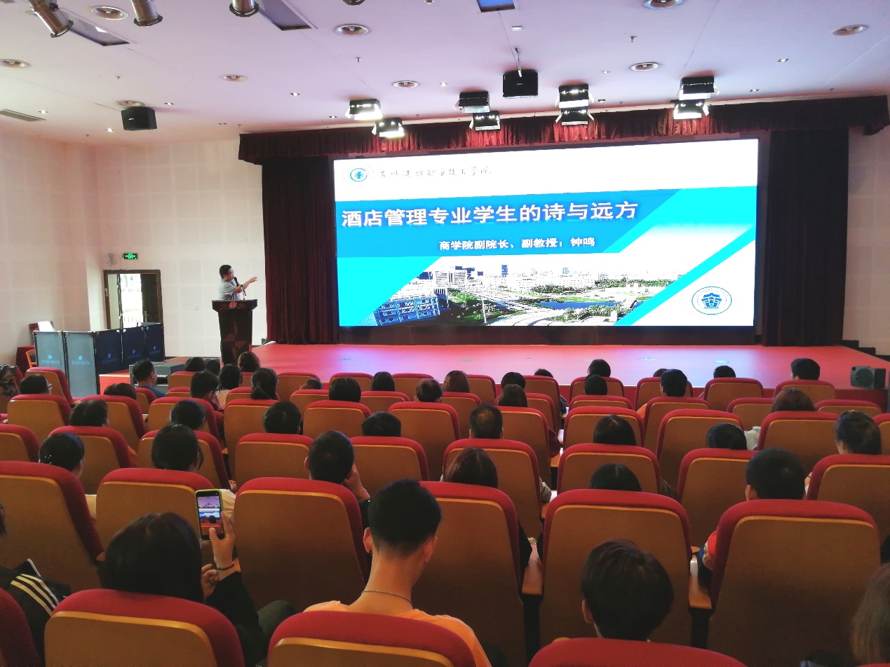 商学院钟鸣副院长首先以“酒店管理专业学生的诗与远方”为题,为同学们初步说明“雅高酒店集团”为本次合作提供的6家支持酒店,以及与问鼎(中国)的合作渊源。钟院长也鼓励学生认认真真学好专业知识,踏踏实实走好职业道路;并且与家长沟通交流,建议家长做好心理建设,对孩子关爱而不溺爱,与学校、企业一起为学生的成长助力。
