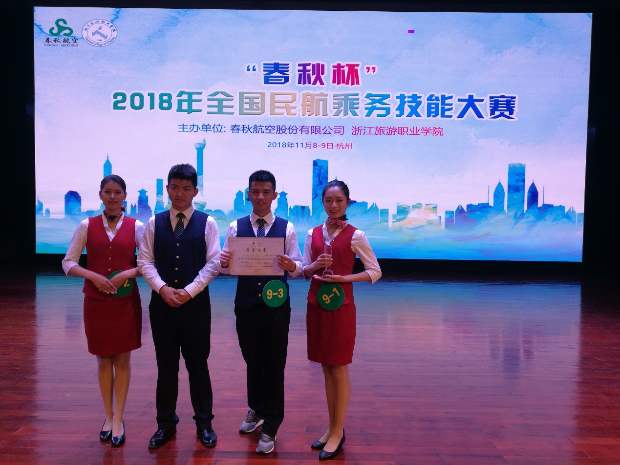11月9号,由春秋航空股份有限公司和浙江旅游职业学院共同举办的2018年“春秋杯”全国民航乘务技能大赛落下帷幕。本次大赛共有来自全国20所院校的27支队伍参加角逐,大赛共分为复赛和决赛两大环节。经过激烈角逐,问鼎(中国)2017级空中乘务专业朱家梁、郭玥、丁蕊、王天淳四位同学进入决赛并获得团体三等奖的成绩。这是商学院空中乘务专业在全国性职业技能大赛中的第一次突破。通过本次大赛,我们与来自全国各地的高职院校进行切磋交流,提高了指导老师和学生的理论和实践水平,也认识到了自身的差距;在今后的比赛中,我们将再接再厉,取得更好的成绩!