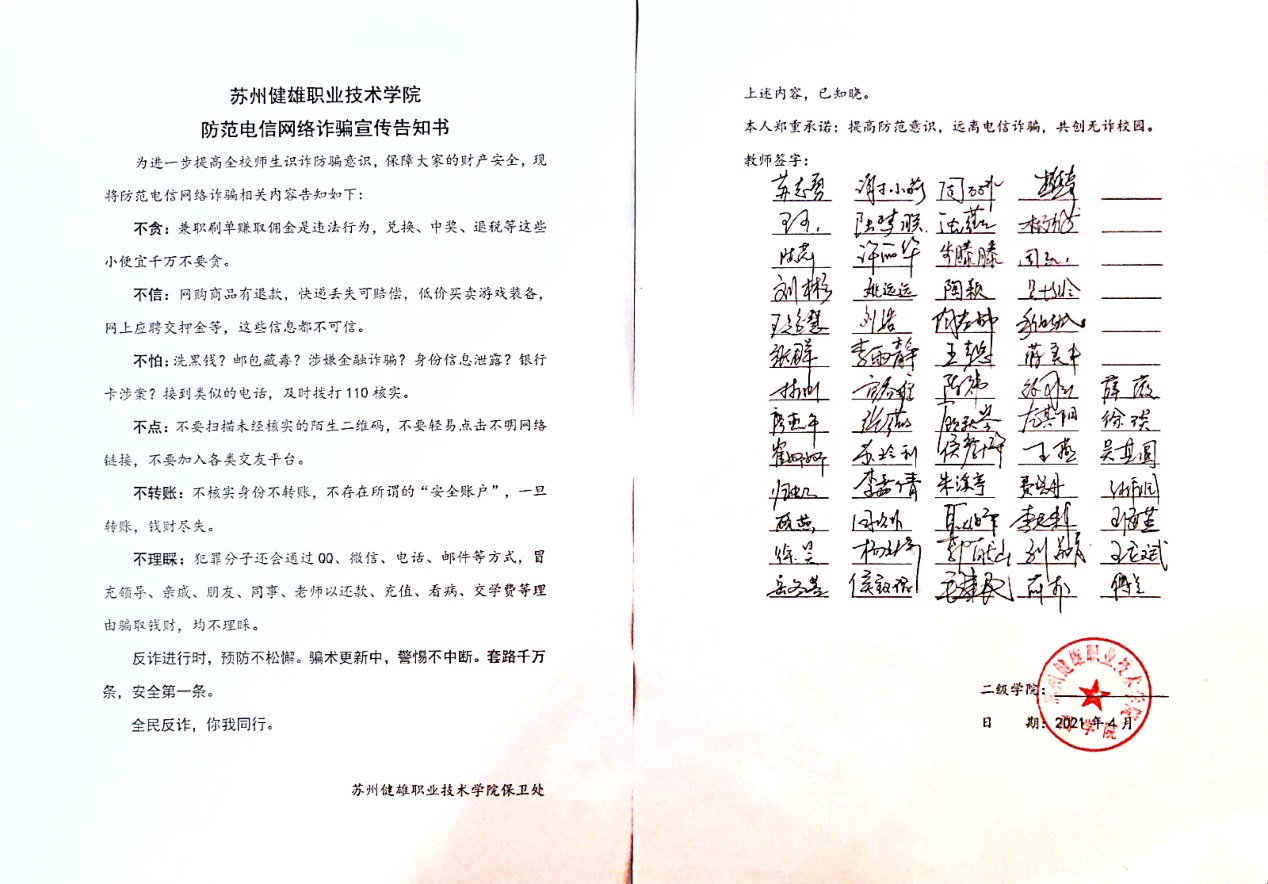学校师生是电信网络新型违法犯罪的易受侵害群体,也是当前电信网络诈骗的重灾区。会议通报了学校电信网络诈骗的发案情况、典型案例,打击治理电信网络诈骗面临的严峻形势和工作举措,介绍了电信网络诈骗案件中相对突出的手段和太仓市公安局“娄东无诈”防诈骗平台操作平台。会议最后开展了教职工防范电信网络诈骗签名活动,全体教师签订了防范电信网络诈骗宣传告知书。会后,所有班级包括实习和社招弹性制所有学生都签订了防范电信网络诈骗宣传告知书。