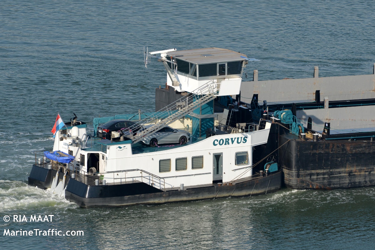 这艘驳船叫CORVUS号,常见于欧洲地区。它延续了FIXUT MARIS号的可升降驾驶台,在内河运输时候的安全性以及通过性也是极其优秀。它与FIXUT MARIS号最大的区别在于采用“顶推”的运输方式-其自身没有固定的船体,通过缆绳绑扎的方式,把装有集装箱的船体和它绑扎在一起,推动集装箱船体来达到运输货物的目的。这种船尾和船头可分离式运输类似于公路运输中的甩挂运输,当驳船把货物安全运送到码头之后,它可以与集装箱船体分离,再去运输下一个装有集装箱的船,大大提高了船舶运输效率。CORVUS号虽然仅长129米,宽23米。但是通过顶推,其可以推动多个船体,同时进行运输货物,这也是FIXUT MARIS号无法比拟的。