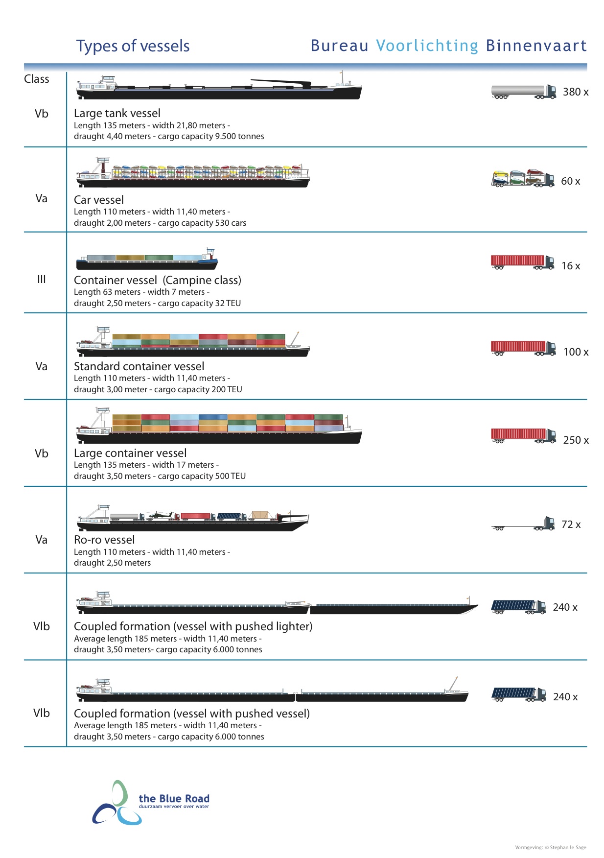 Va | Standard Container vessel (Campine class)标准集装箱驳船 长110米,宽11.40米 吃水3.0米,载箱量200TEU |