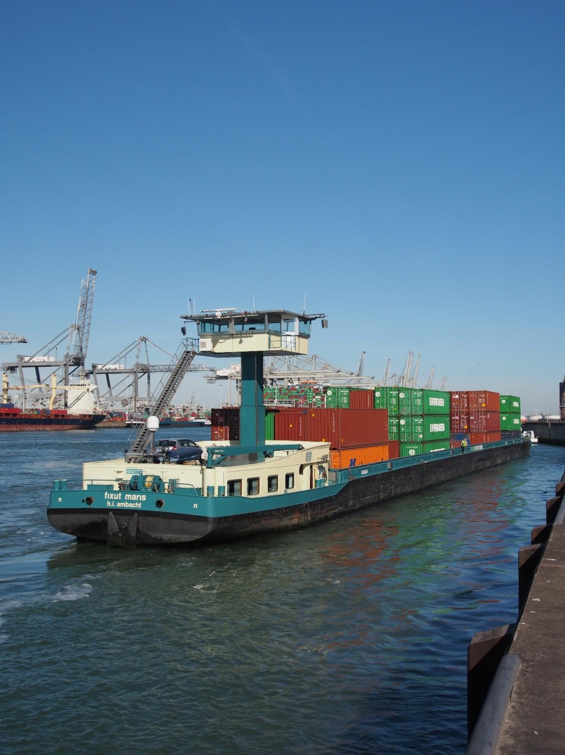 图片中的这艘船舶为:FIXUT MARIS号。它长136米,宽13米。这种船型在欧洲地区的内河较为常见。其最大的特点是具有可升降驾驶台。这一设计的好处是提高了船舶安全性以及通过性。甲板上的集装箱装载到一定高度之后,容易影响视线,这时把驾驶台上升起来,可以给驾驶员提供良好的视线,保证了船舶的安全航行。而当在内河航行中遇到桥梁的时候,驾驶台可以下降至最低,以确保安全通过桥梁。