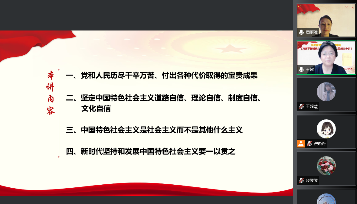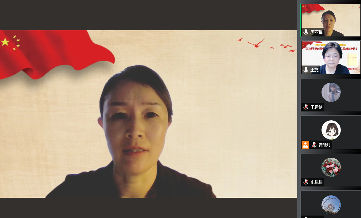 为深入学习贯彻习近平新时代中国特色社会主义思想,以实际行动迎接党的二十大胜利召开,经济管理学院党总支组织广大教师党员接力领学《习近平新时代中国特色社会主义思想三十讲》,学思践悟新思想,接续奋斗新时代。6月8日,由团总支书记王玉、教工党支部书记王懿分别带领全体党员学习了《第一讲》和《第二讲》的内容。