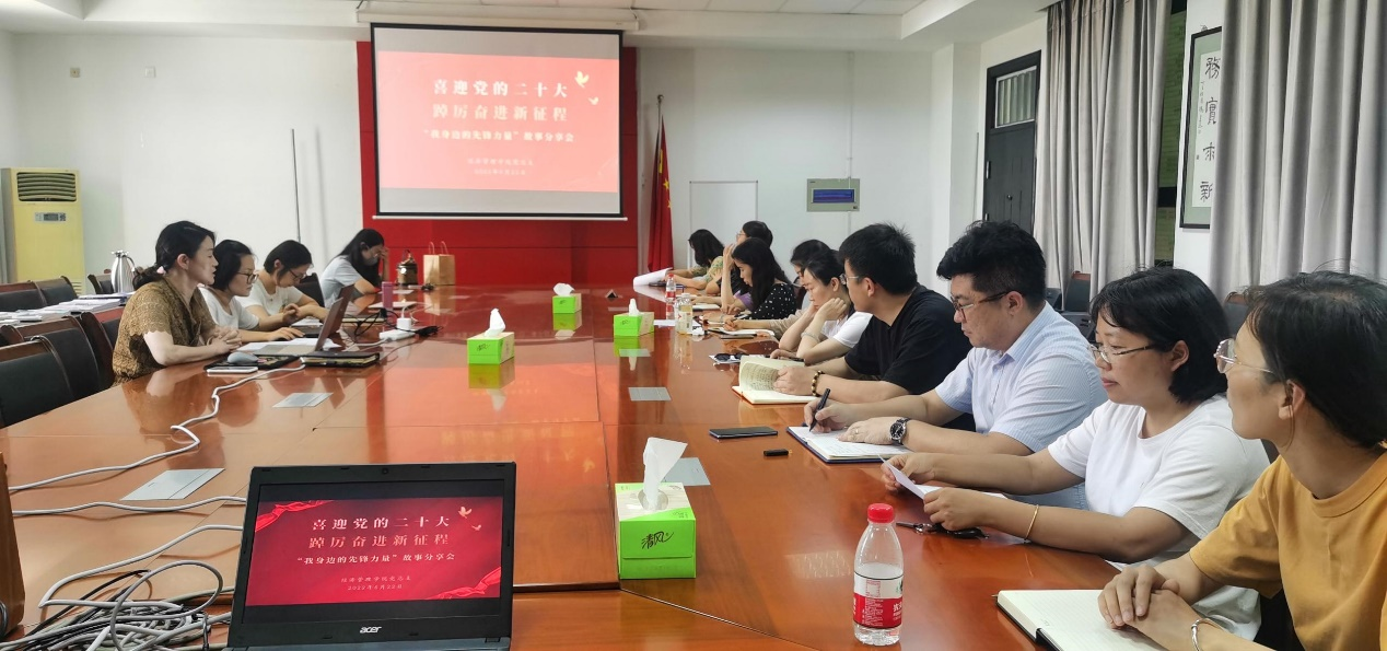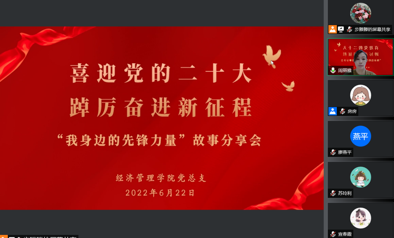 6月22日下午,经济管理学院全体党员教师通过线上、线下两种形式,开展了“喜迎党的二十大·踔厉奋进新征程”主题活动“我身边的先锋力量”故事分享会,会议由党总支副书记周丽雅主持。党员费晓丹、李志辉、侯彦博、王超慧、王懿5位“榜样”教师从疫情防控、教科研究、校企合作、学生管理等方面先后分享了自己在岗位上的奋斗故事以及身边先锋党员的事迹。