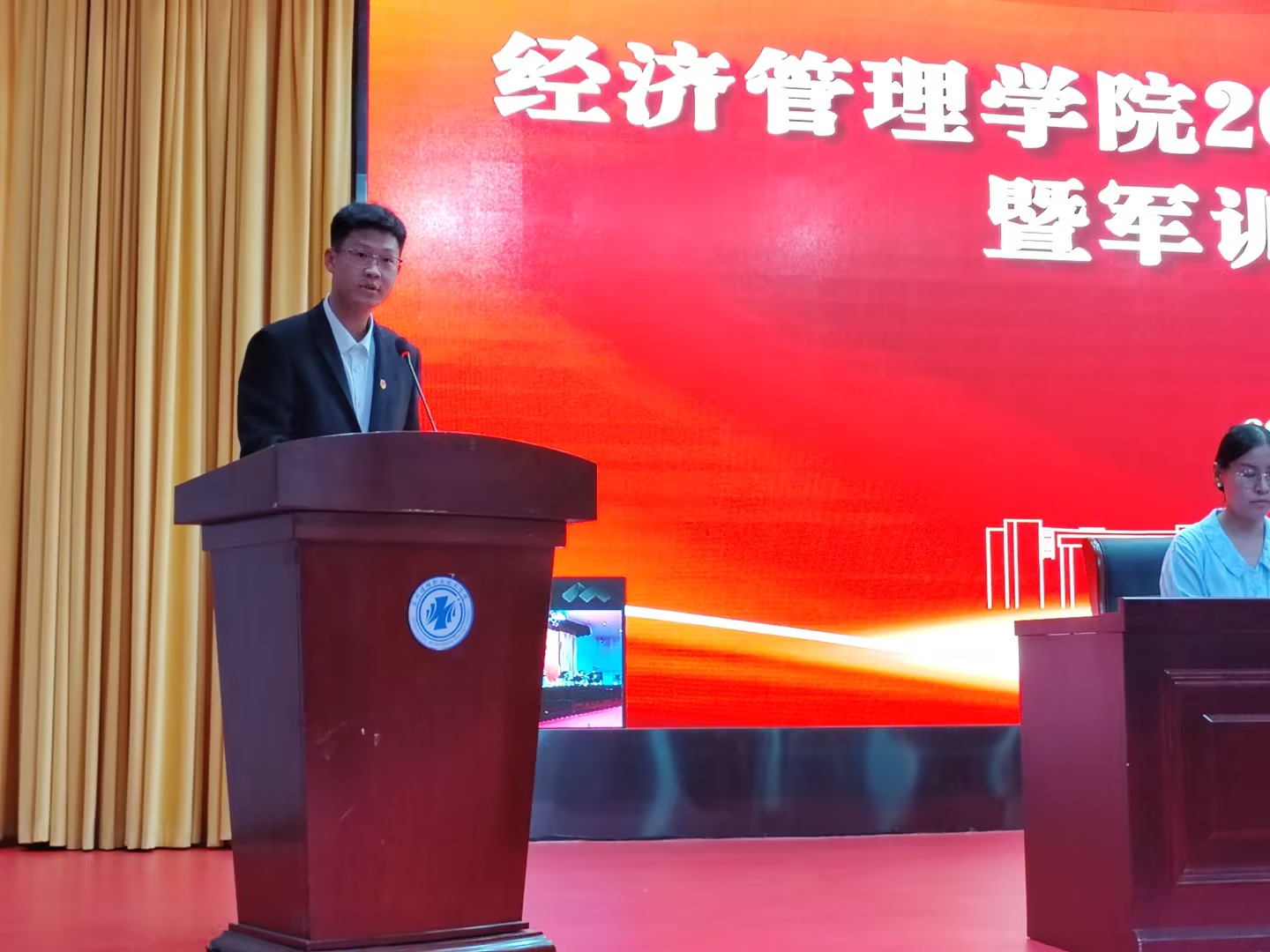 2023年9月16日下午,经济管理学院2023级新生开学典礼暨军训动员大会在图书馆报告厅隆重召开,学院全体党政领导班子、23级新生辅导员、班主任和全体23级新生参加,大会由辅导员顾宇婷主持。