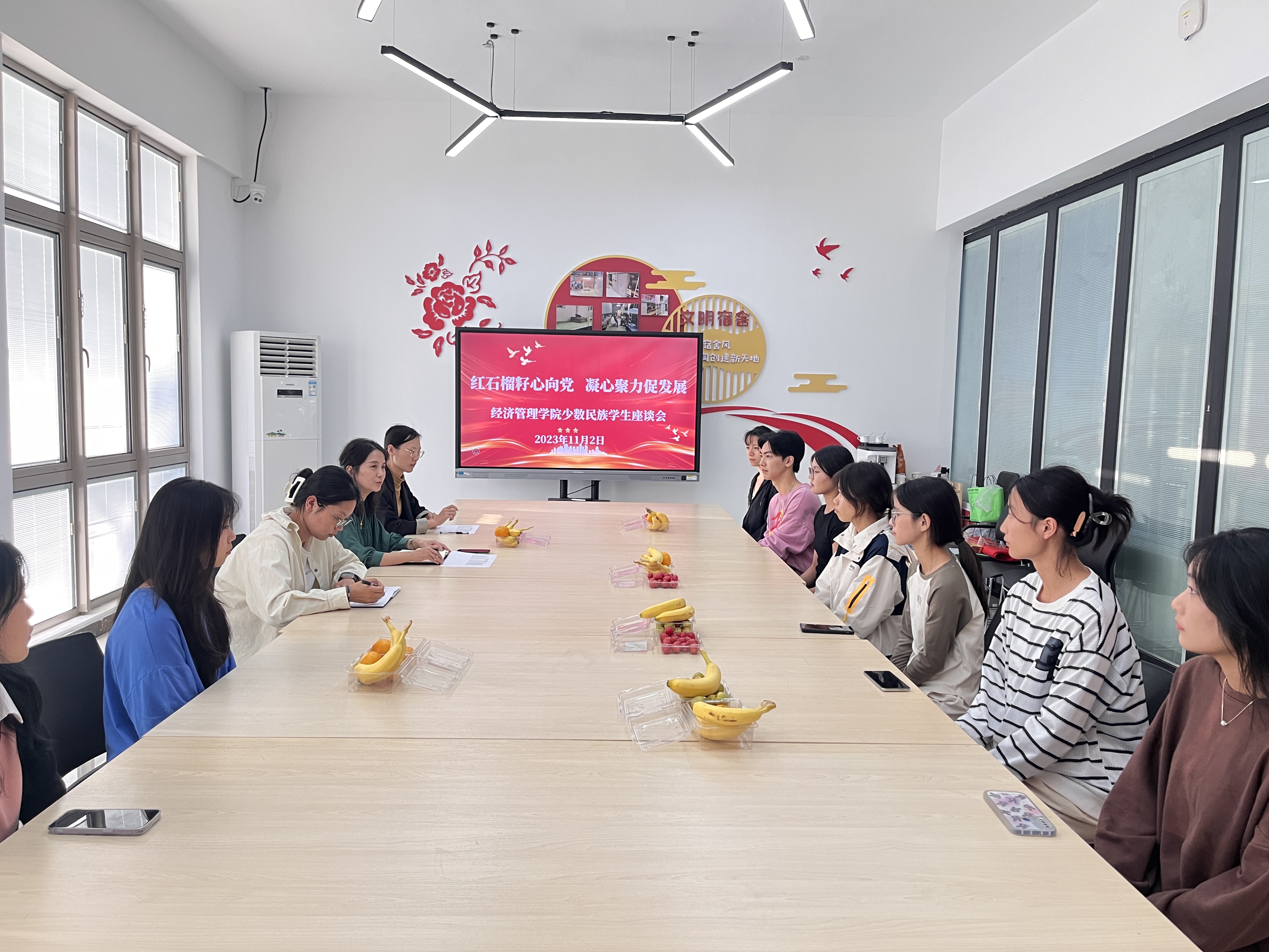 为进一步做好少数民族学生培养工作,提升少数民族学生教育服务水平,加强与少数民族学生的交往交流交融,2023年11月2日下午,经济管理学院在紫薇社区组织开展“我为师生办实事之‘红石榴籽心向党 凝心聚力促发展’”少数民族学生座谈会。经济管理学院党总支副书记沈晓婷,辅导员王富友、顾子琪、张丽丽及少数民族学生代表参加会议。