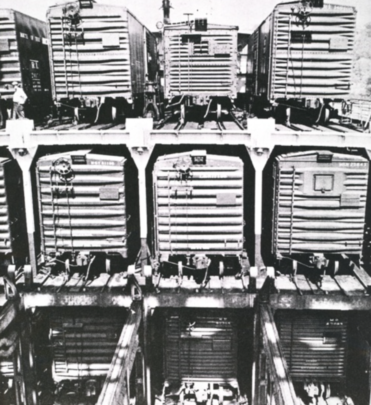 装满车厢的船舱,可见船舱已经具备网格状并设有轨道,和现代集装箱船有异曲同工之妙,只是车厢车架不能分离,在空间利用率上尚有不足。但在装卸效率上在那个年代已是登峰造极。