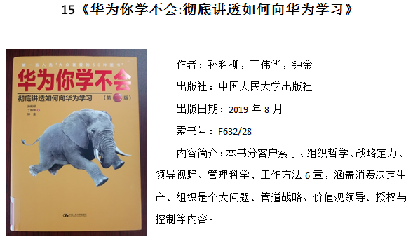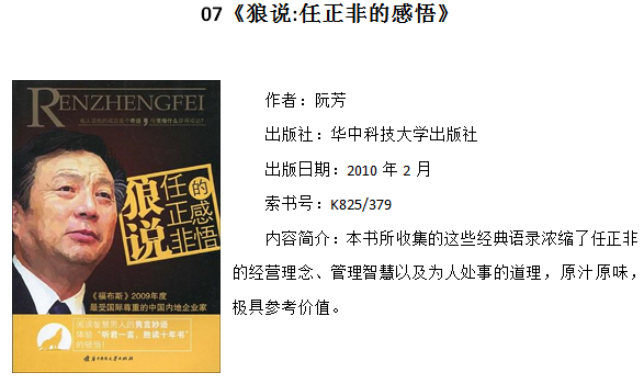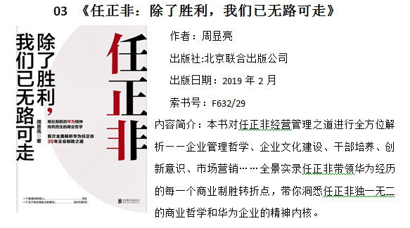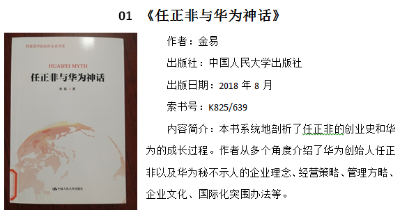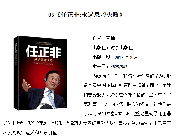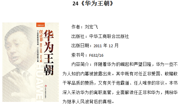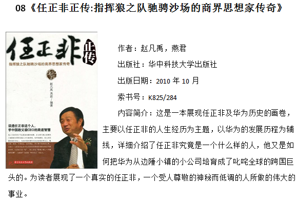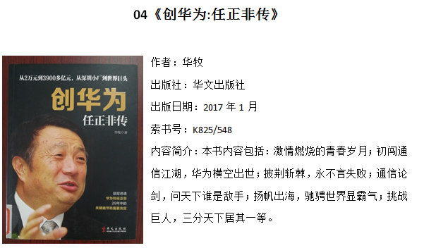 编者按:任正非历经沉浮坎坷,却最终披荆斩棘,是中国时代的传奇人物。而他所创建的华为成为最成功的科技企业之一,万人瞩目。为了便于读者了解任正非与华为,图书馆采购了有关图书,现以飨读者。