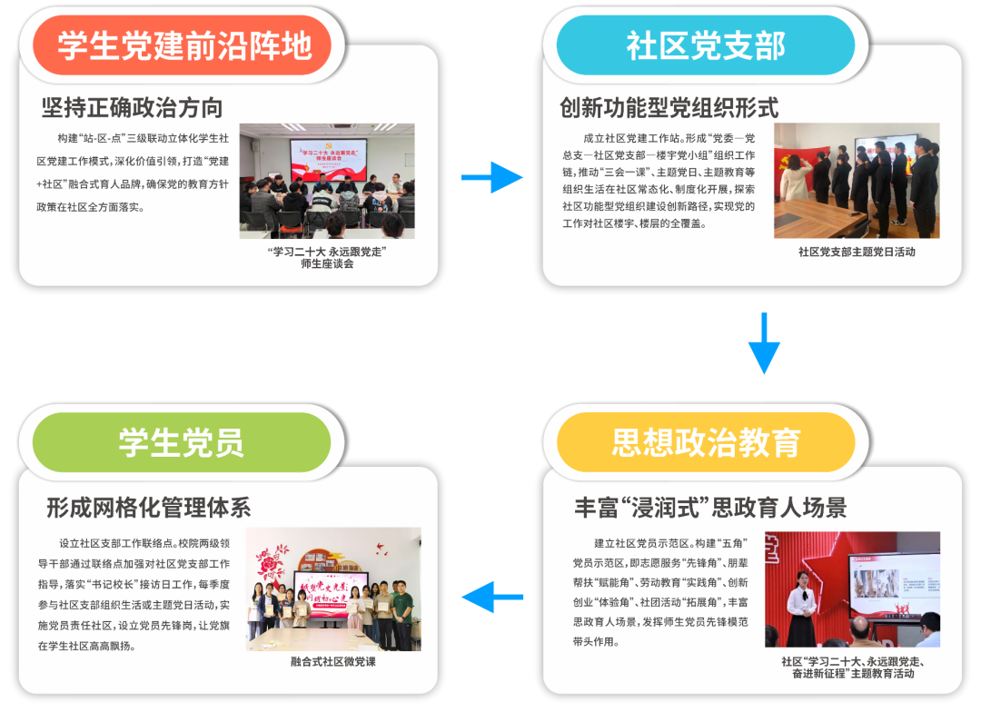 问鼎网页版登录入口2022年4月启动“—站式”学生社区建设项目,2022年12月成功申报教育部“一站式”学生社区建设单位。问鼎(中国)“一站式”学生社区建设始终以习近平新时代中国特色社会主义思想为指导,坚持立德树人根本任务,坚守“为党育人 为国育才”,紧密围绕学院“四深三仓”办学理念和高水平校建设总体要求,以党建为引领,以学生为中心,立足双元制本土化实践,聚焦现代化产业技术人才培养,探索创新具有职业教育类型特色的“一站式”学生社区综合管理模式。