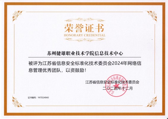 近日,我校在数字校园建设领域喜获两项省级、市级重磅荣誉——由江苏省信息安全标准化技术委员会授予“2024年网络信息管理优秀团队”称号,同时获评苏州市计算机学会数字化校园专业委员会“2024年智慧校园建设先进集体”。这一双项殊荣标志着学校在信息化建设、网络安全及智慧教育领域的创新实践取得了进一步的成效。